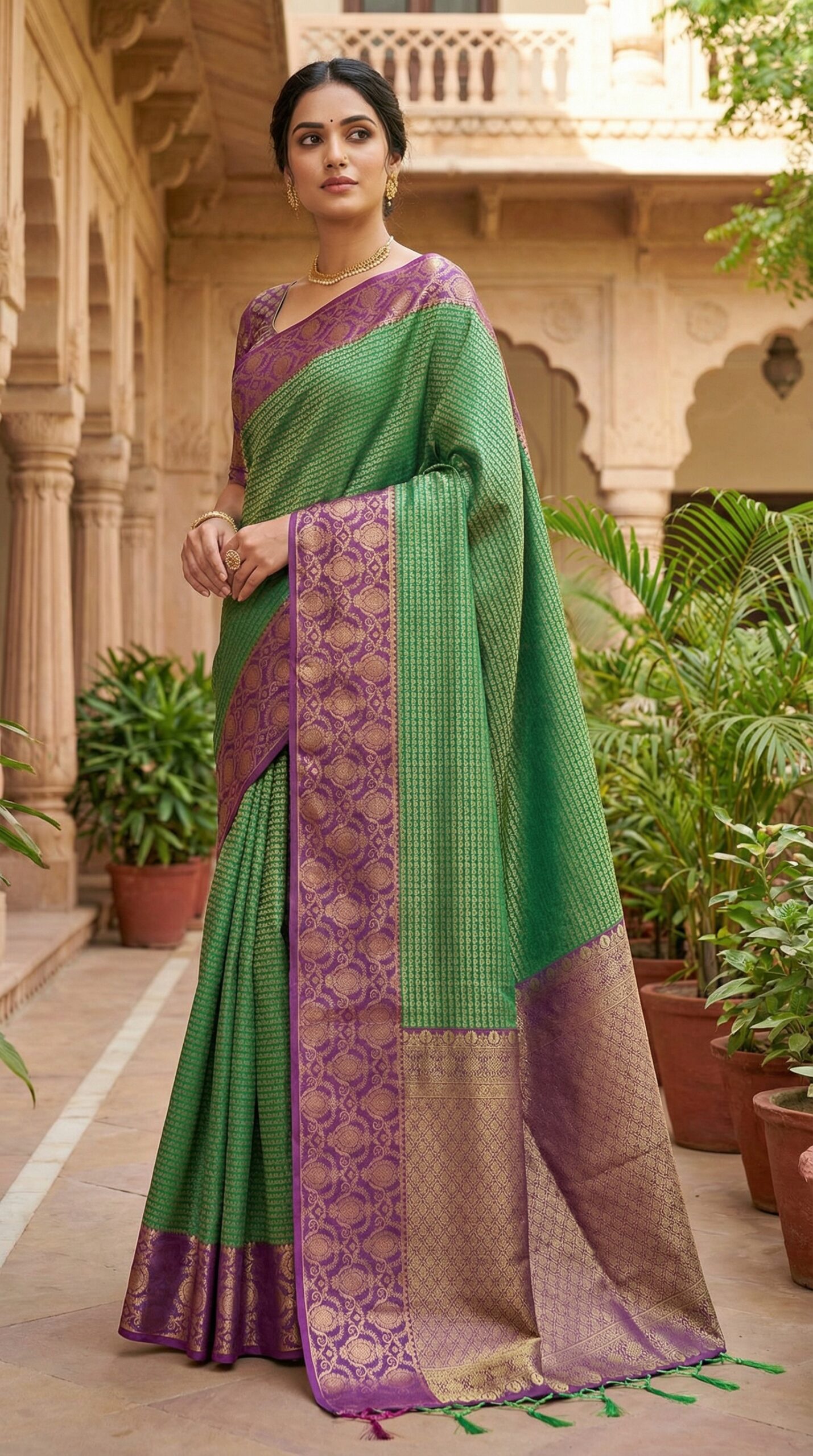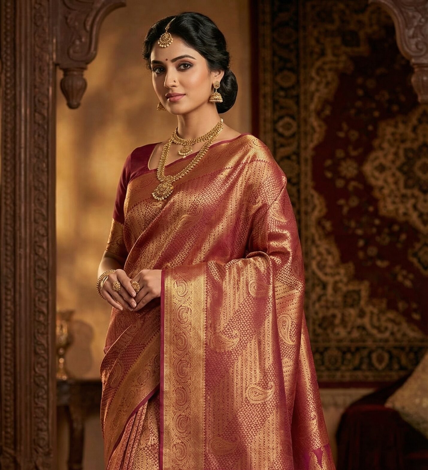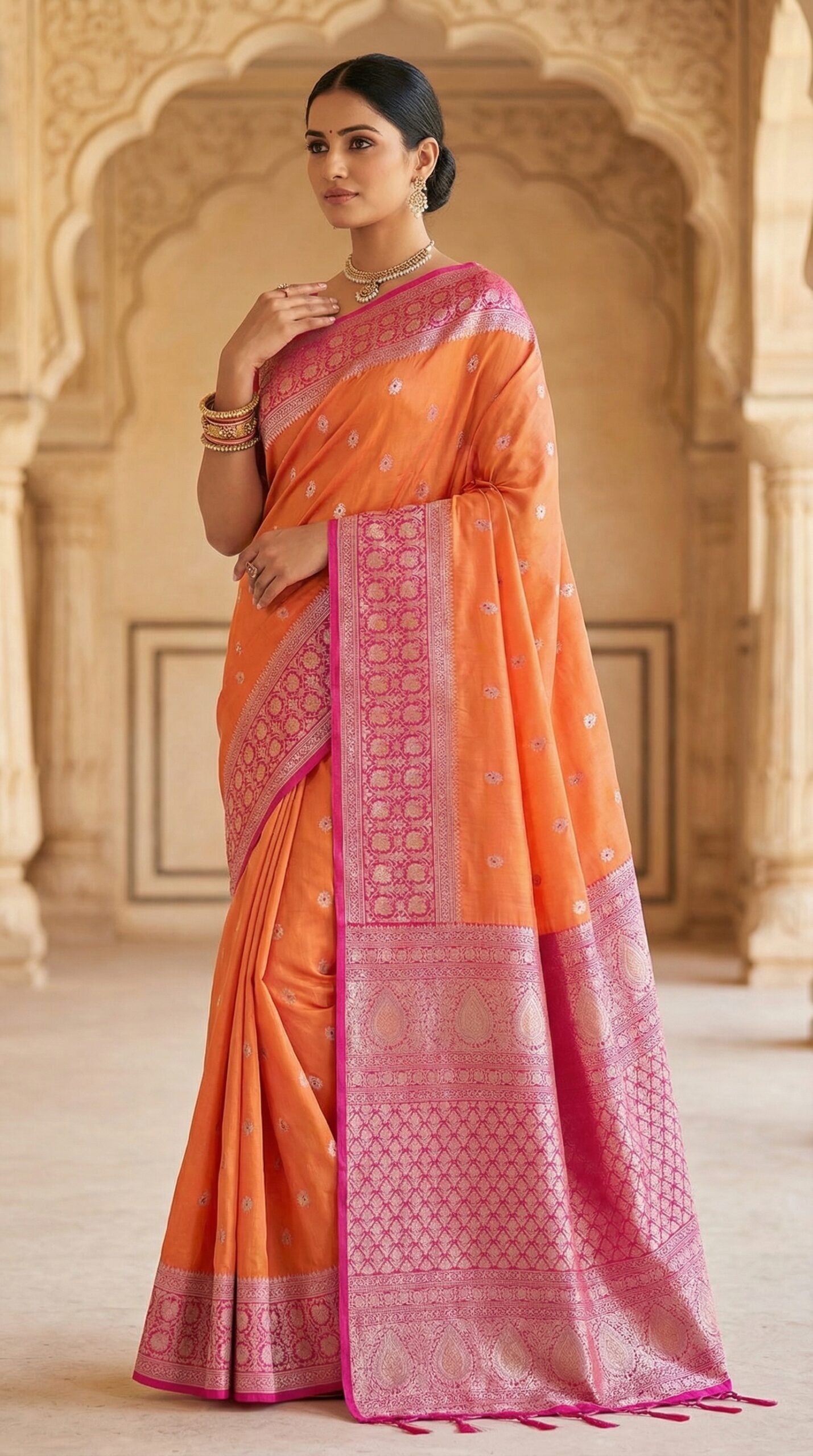 Hand-woven silks with rich zari and grand borders, crafted for weddings and once-in-a-lifetime moments.