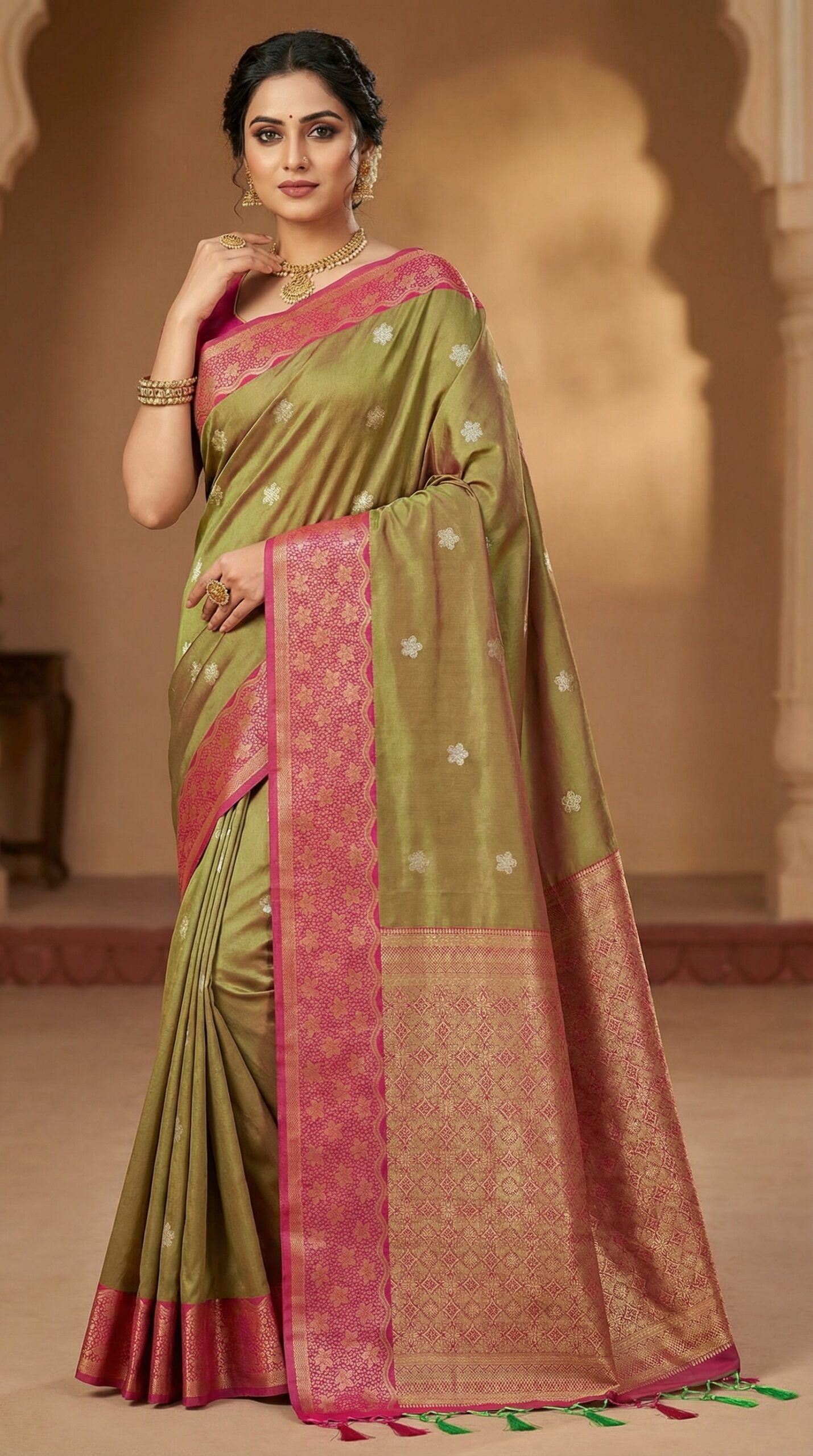 Featuring an antique gold base paired with a rose pink zari border, this soft silk saree reflects classic elegance. The intricate zari detailing enhances its richness, making it ideal for festive celebrations and cultural events.