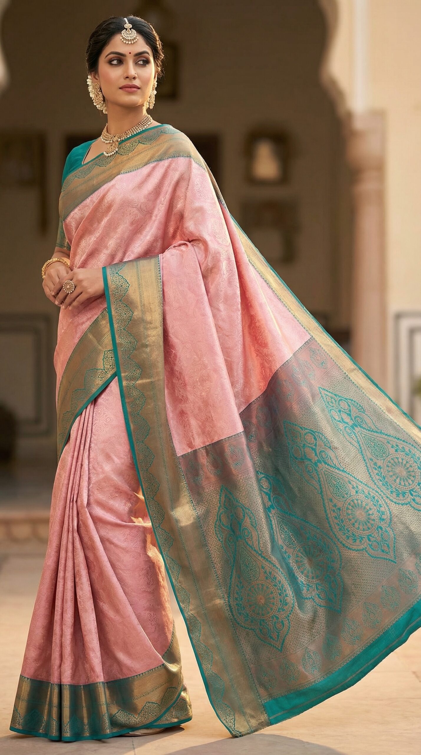 A luxurious blush pink Kanjivaram Silk Saree featuring silver woven motifs paired with a stunning teal green zari border. The heavy pallu enhances the traditional authenticity and elegance. Ideal for bridal wear, festive events, and special functions.