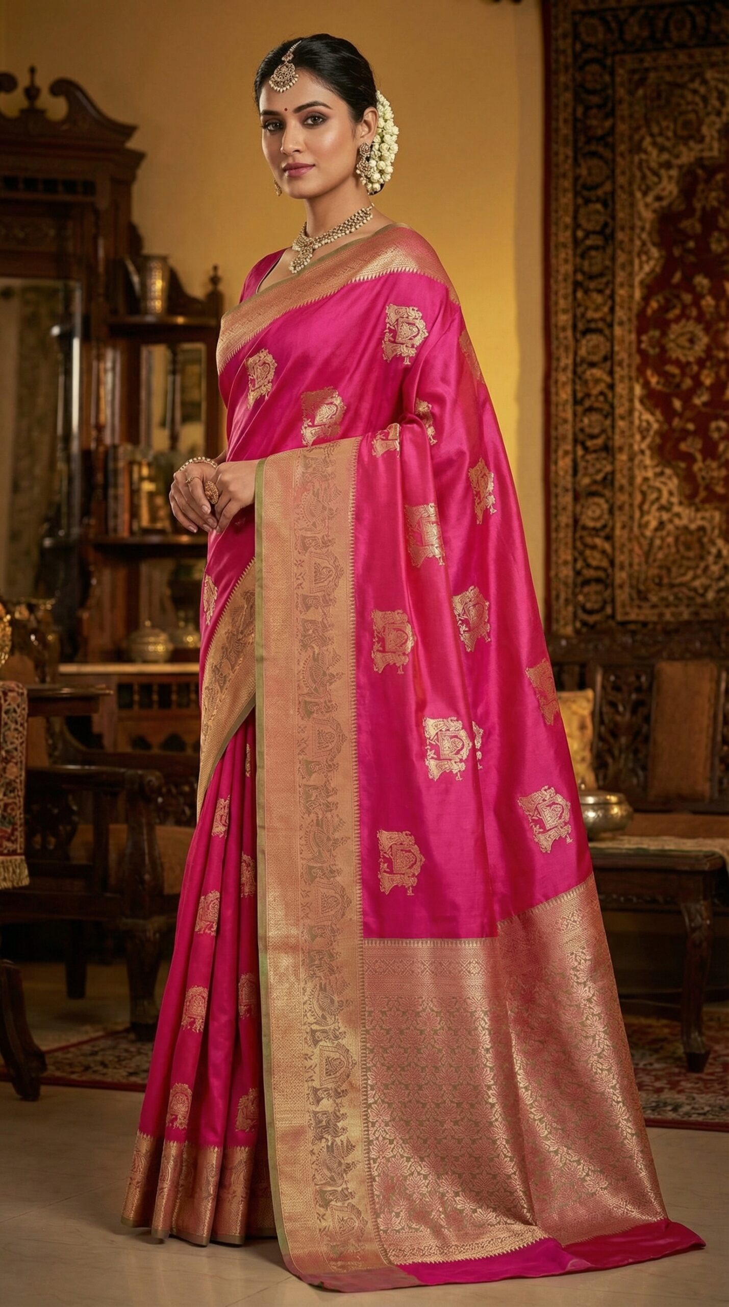 This bright pink soft silk saree is highlighted with a rich gold zari pallu and border, giving it a luxurious festive appeal. The classic motifs and premium finish make it a must-have for wedding and special occasions.