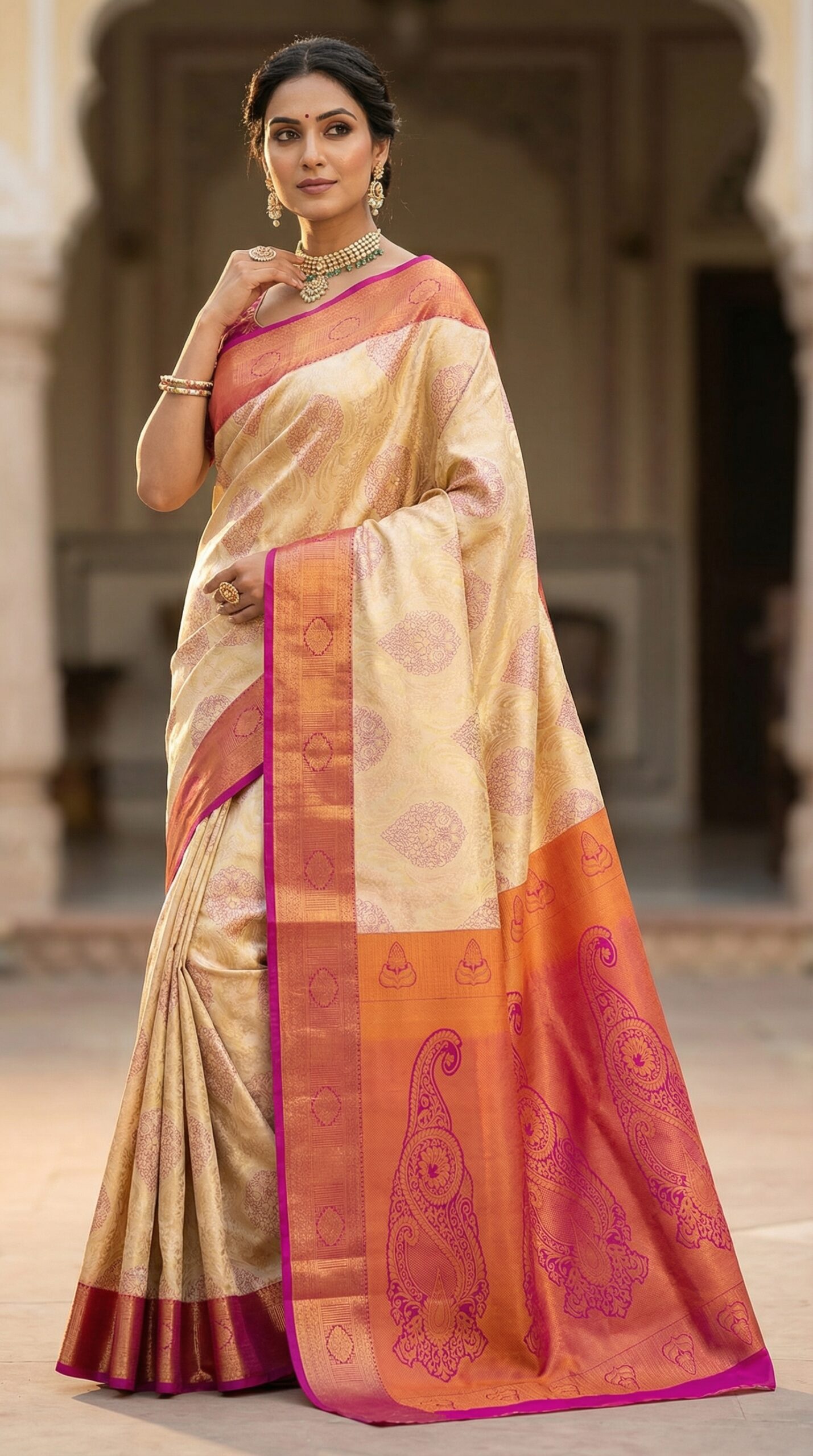 Cream Saree with Pink–Orange Border Silk Saree