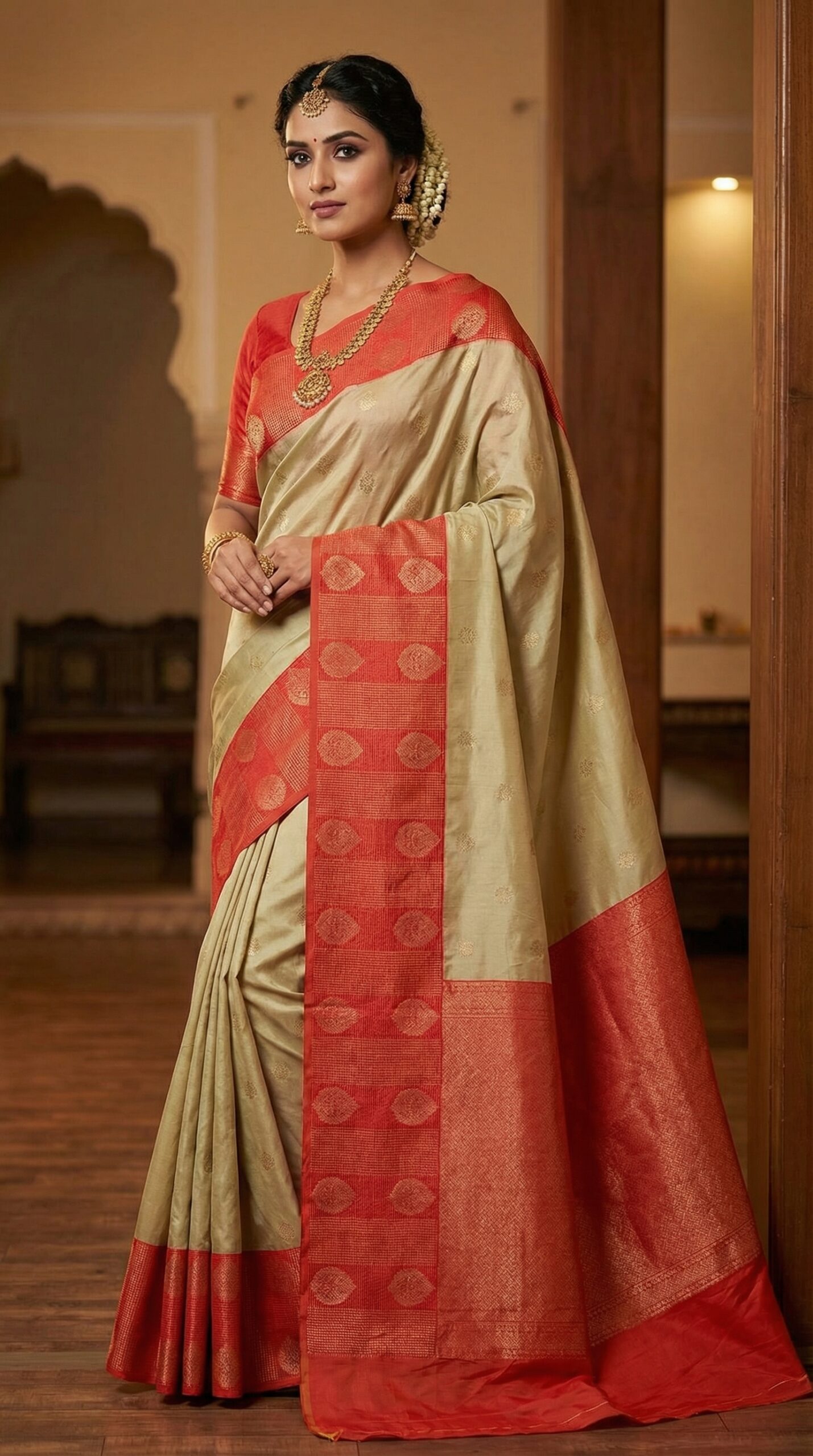 This sophisticated soft silk saree features a premium light gold body decorated with elegant traditional buttas. The vibrant red border adds a striking contrast, enriched with detailed zari weaving that enhances the saree’s richness. Perfect for bridal events, festivals, traditional celebrations, and temple occasions. The lightweight, smooth fabric ensures ease of draping and comfort throughout your day. Includes a stylish red contrast blouse piece.
