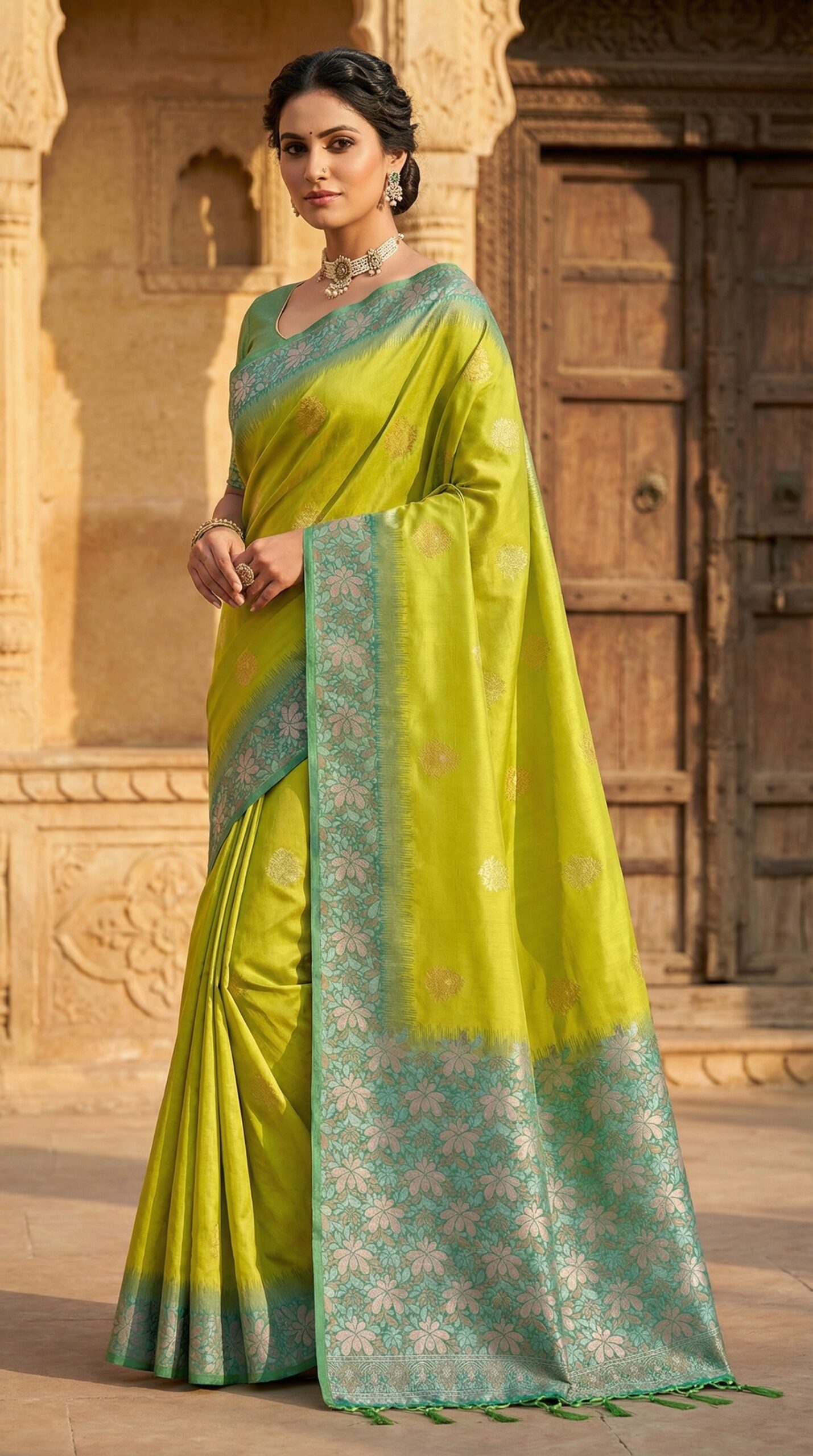 Lime Green Soft Silk Saree with Aqua Floral Zari Border