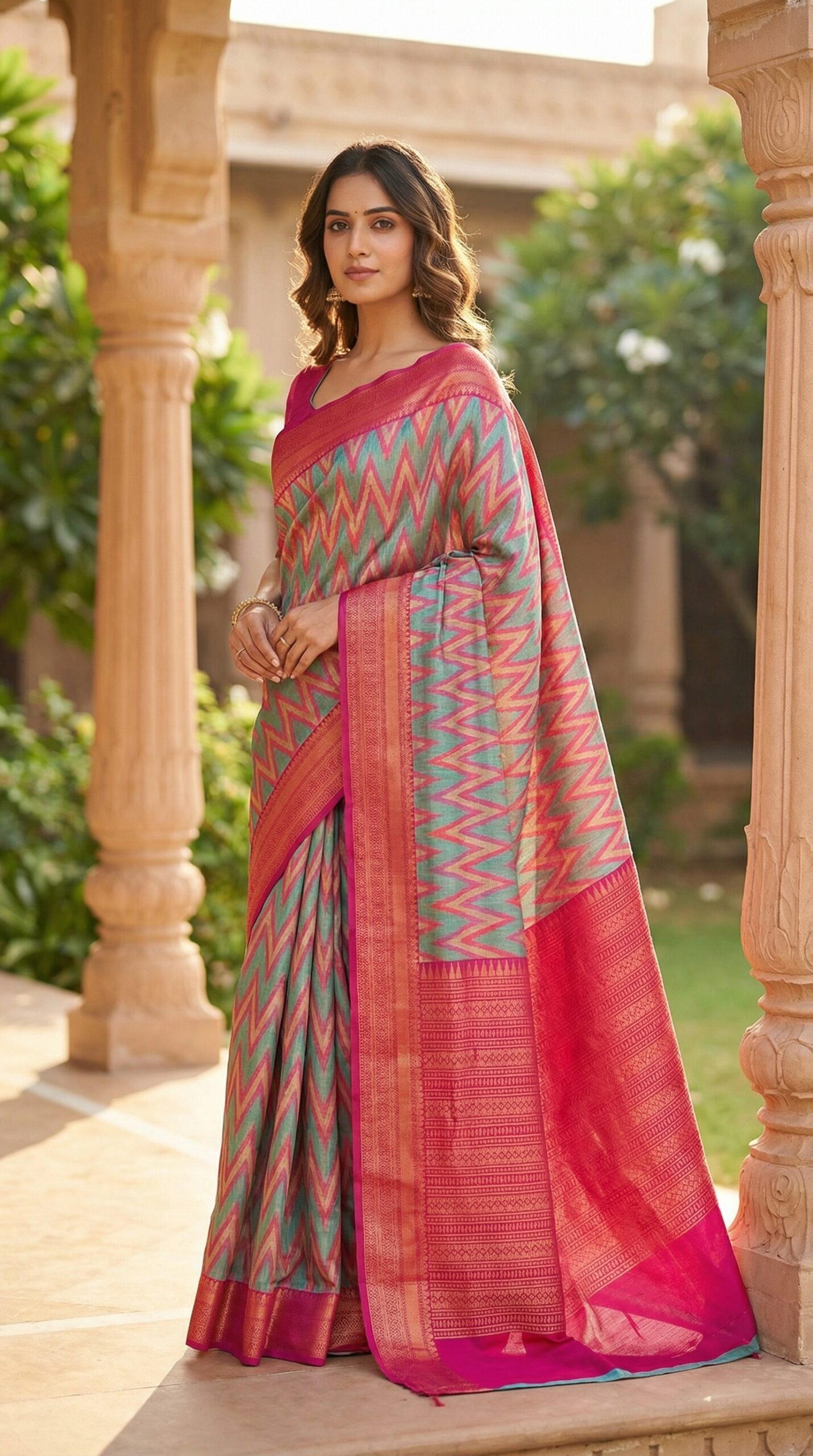 A premium Fancy Cotton Saree highlighting a vibrant interplay of teal, peach, and pink zig-zag motifs. The rich pink zari border enhances the festive appeal, making it ideal for celebrations, casual parties, or ethnic office days. Lightweight cotton fabric gives a comfortable and breathable drape, maintaining structure and grace throughout the day.