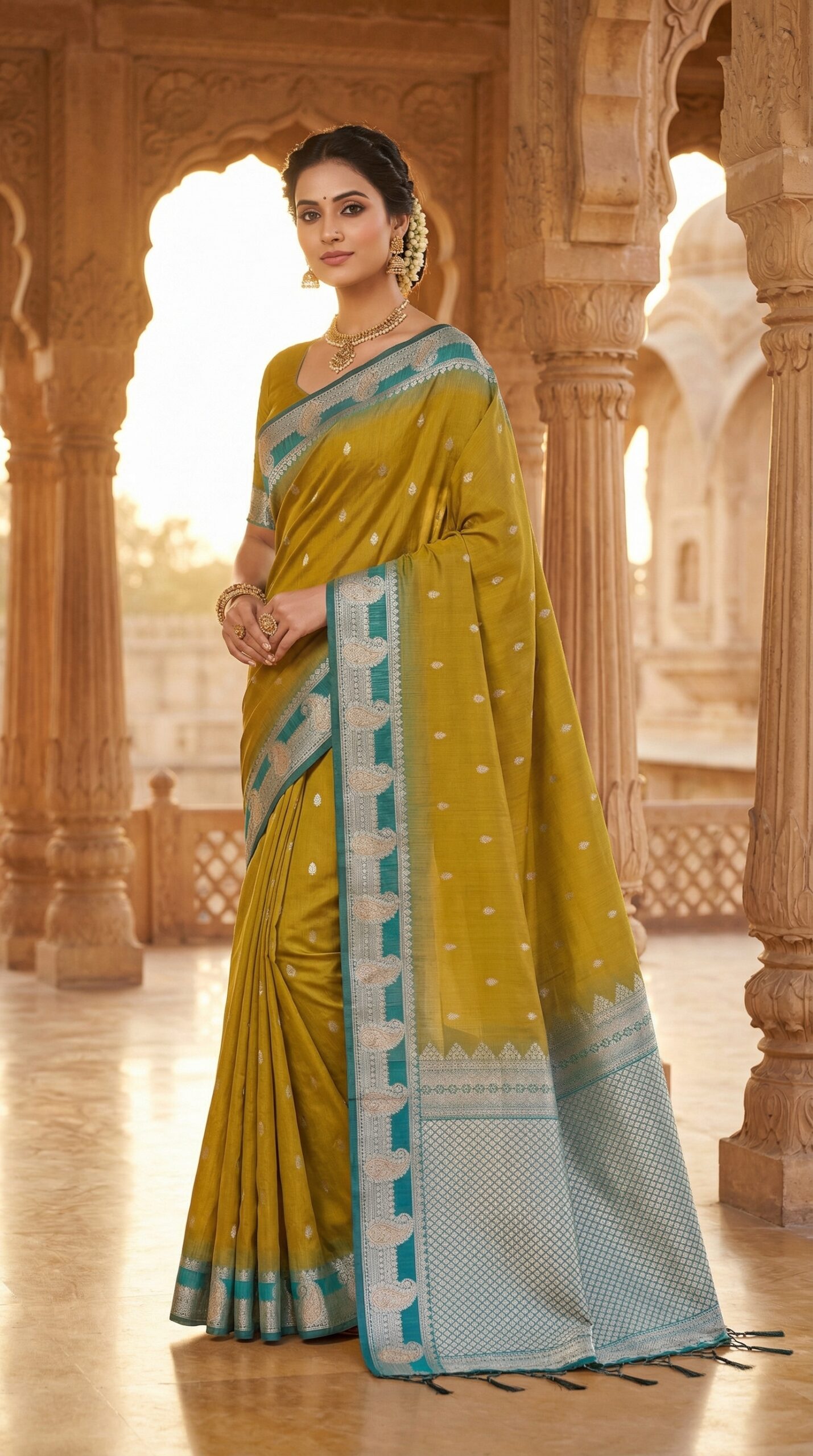This Mustard Yellow Soft Silk Saree brings vibrancy and tradition together. Woven with delicate silver zari motifs and finished with a teal zari border, the saree offers a graceful drape and comfortable feel, making it perfect for festive gatherings and traditional occasions.
