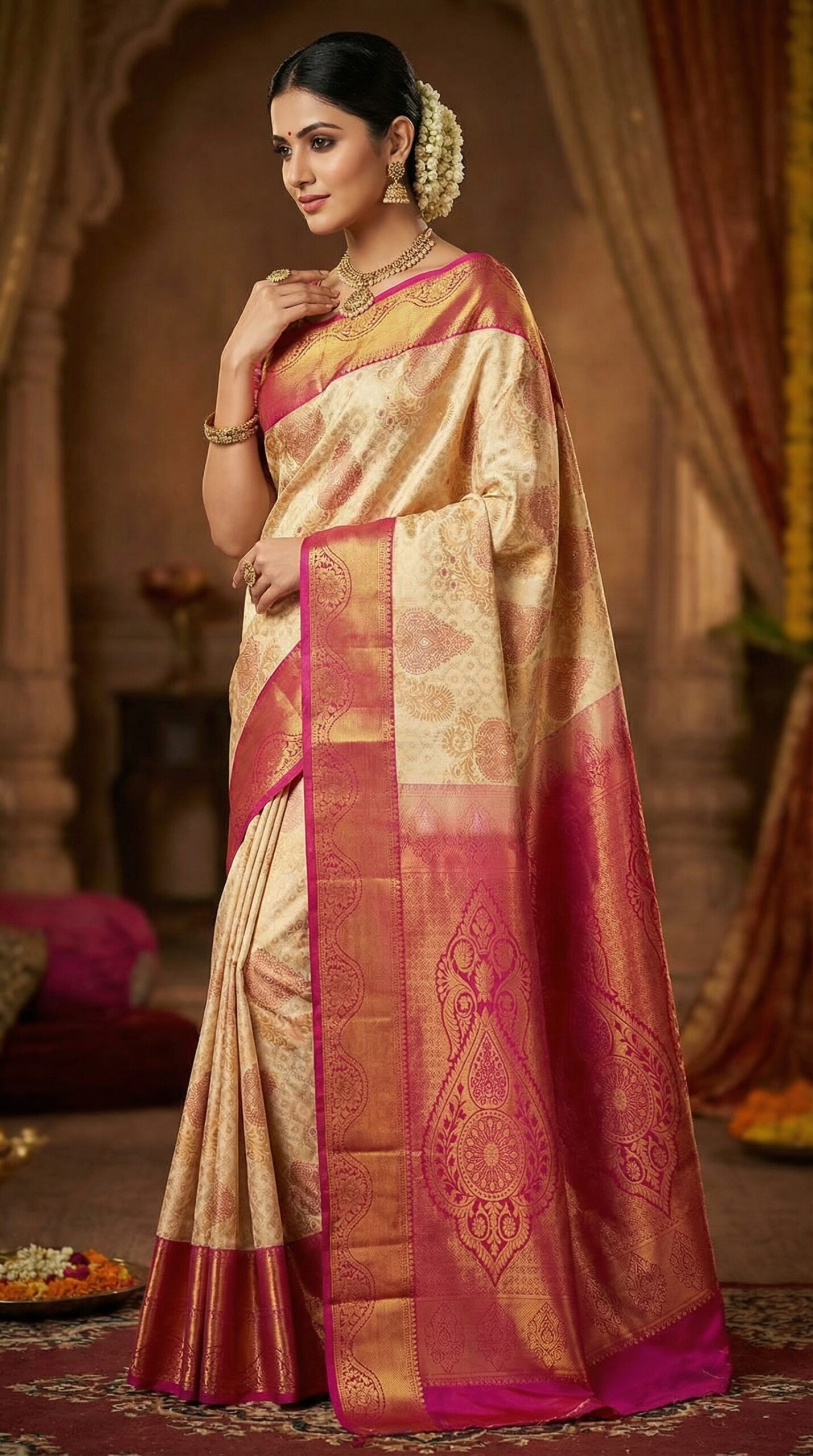 Ivory Off-White & Rani Pink Bridal Kanchipuram Silk Saree