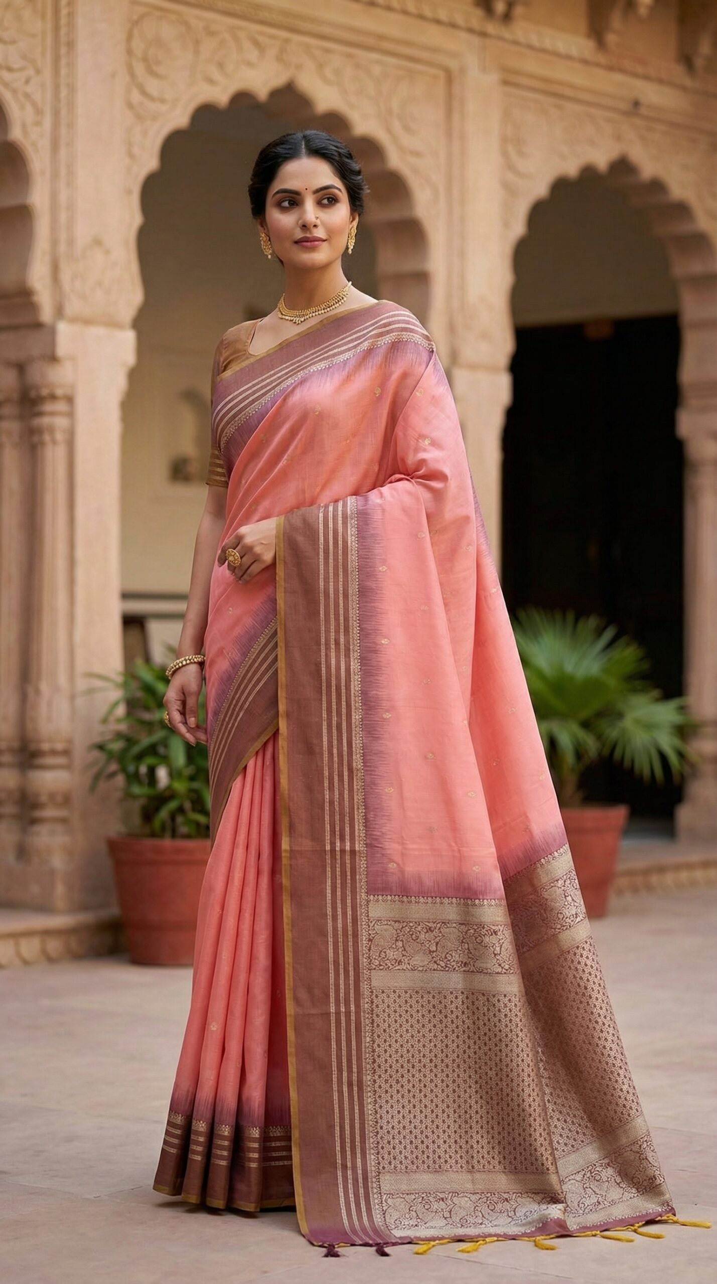 This elegant silk cotton saree features a soothing peach tone enhanced with delicate gold buttas and a richly woven zari border. The lightweight silk cotton blend ensures comfort while maintaining a graceful drape. Perfect for festive celebrations, family functions, and cultural gatherings, this saree offers a timeless charm with understated luxury.
