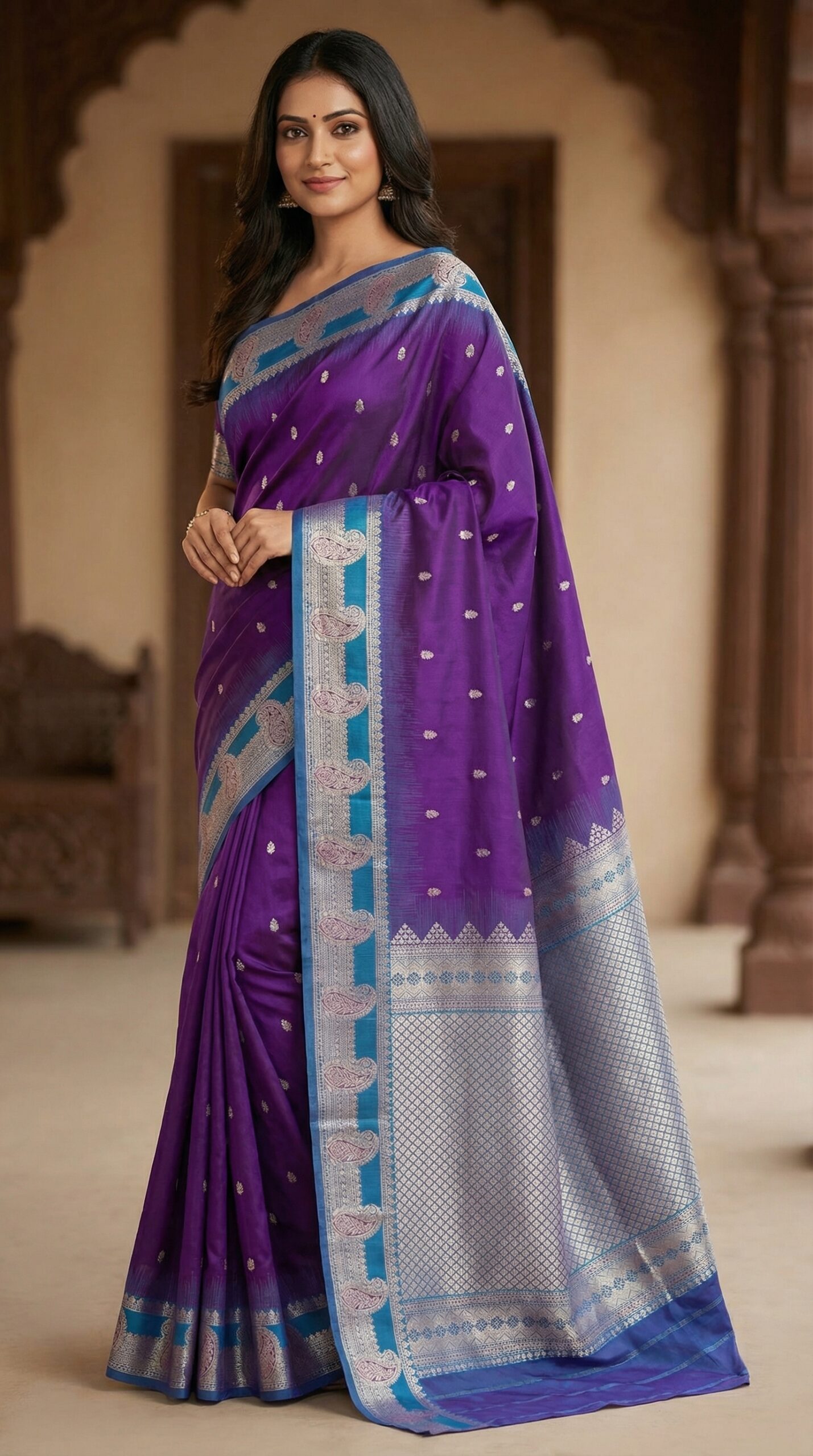 Contrasting blue and silver zari border