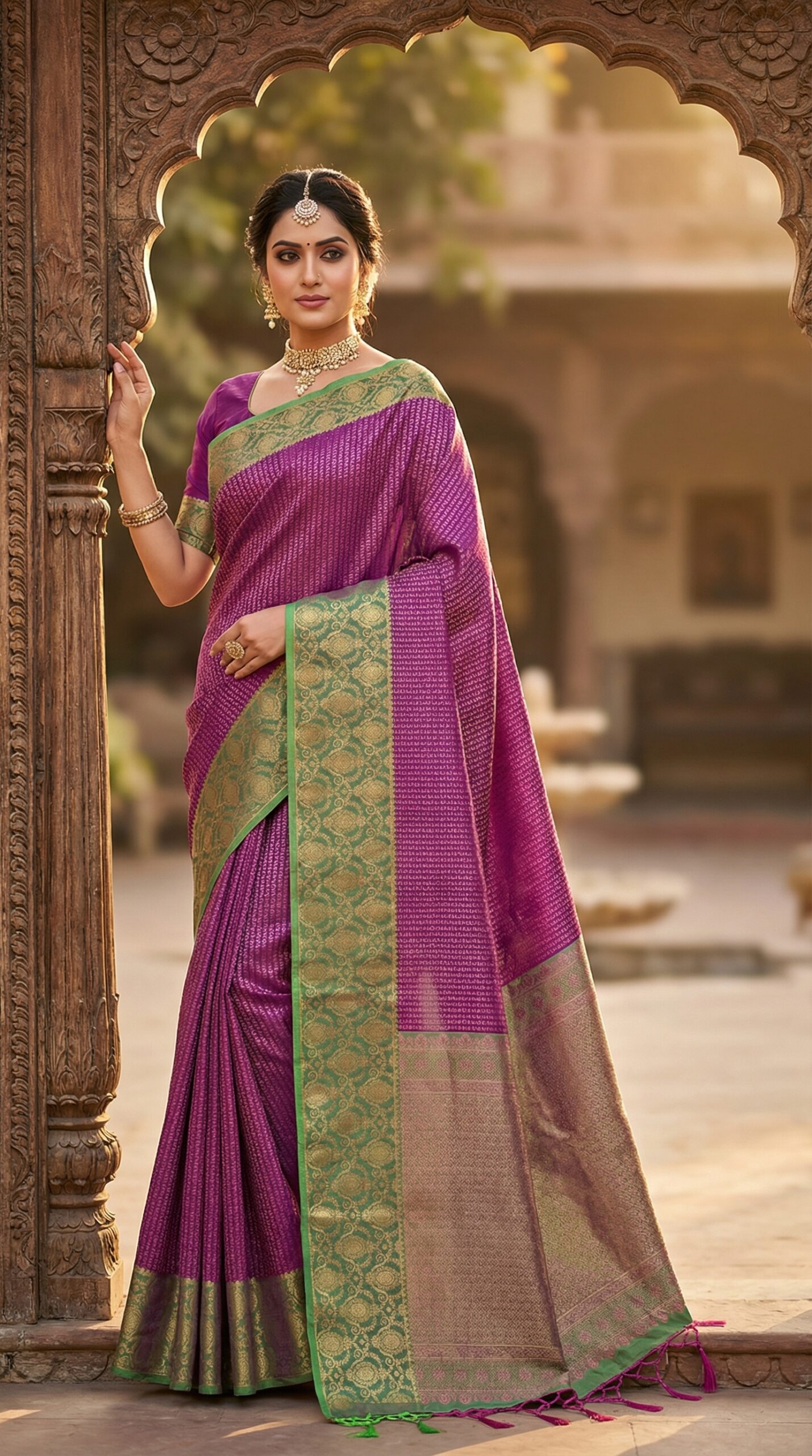 This royal magenta soft silk saree features an elegant lavender floral zari border that enhances its traditional charm. Crafted with premium soft silk, it offers a graceful drape and rich finish, making it perfect for weddings, festive occasions, and cultural celebrations.