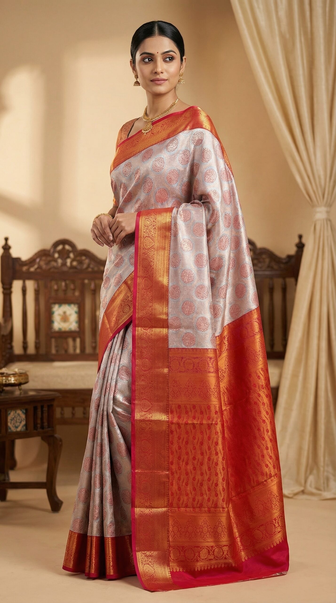 Silver Grey & Red Gold Bridal Kanjivaram Silk Saree