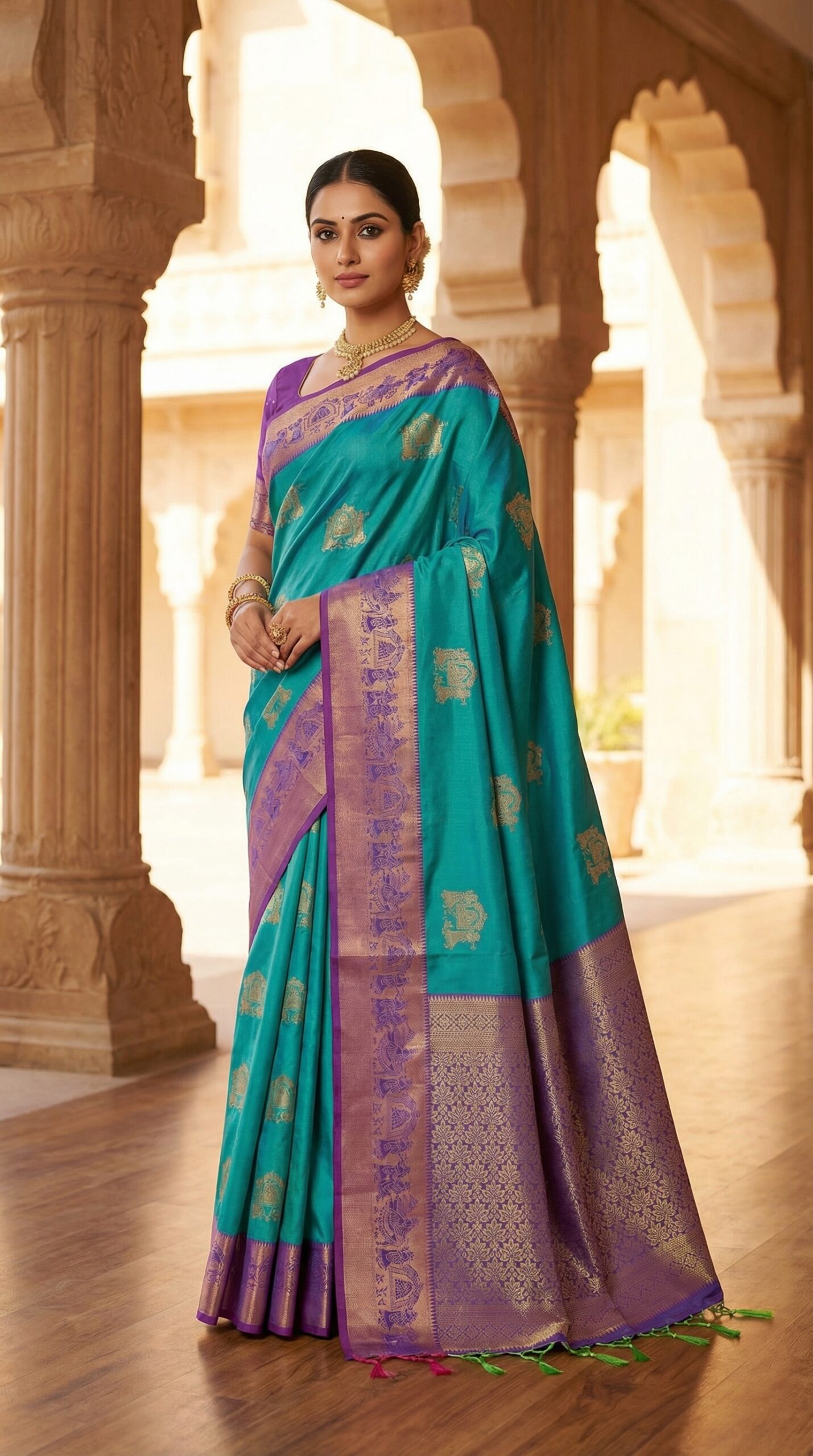 Crafted in premium soft silk, this teal blue saree showcases traditional gold zari motifs complemented by a rich purple zari border and pallu. Its timeless design and smooth finish make it a perfect choice for festive gatherings, family functions, and traditional wear lovers.